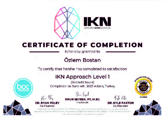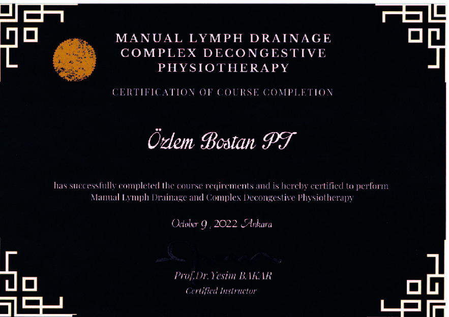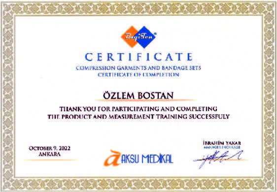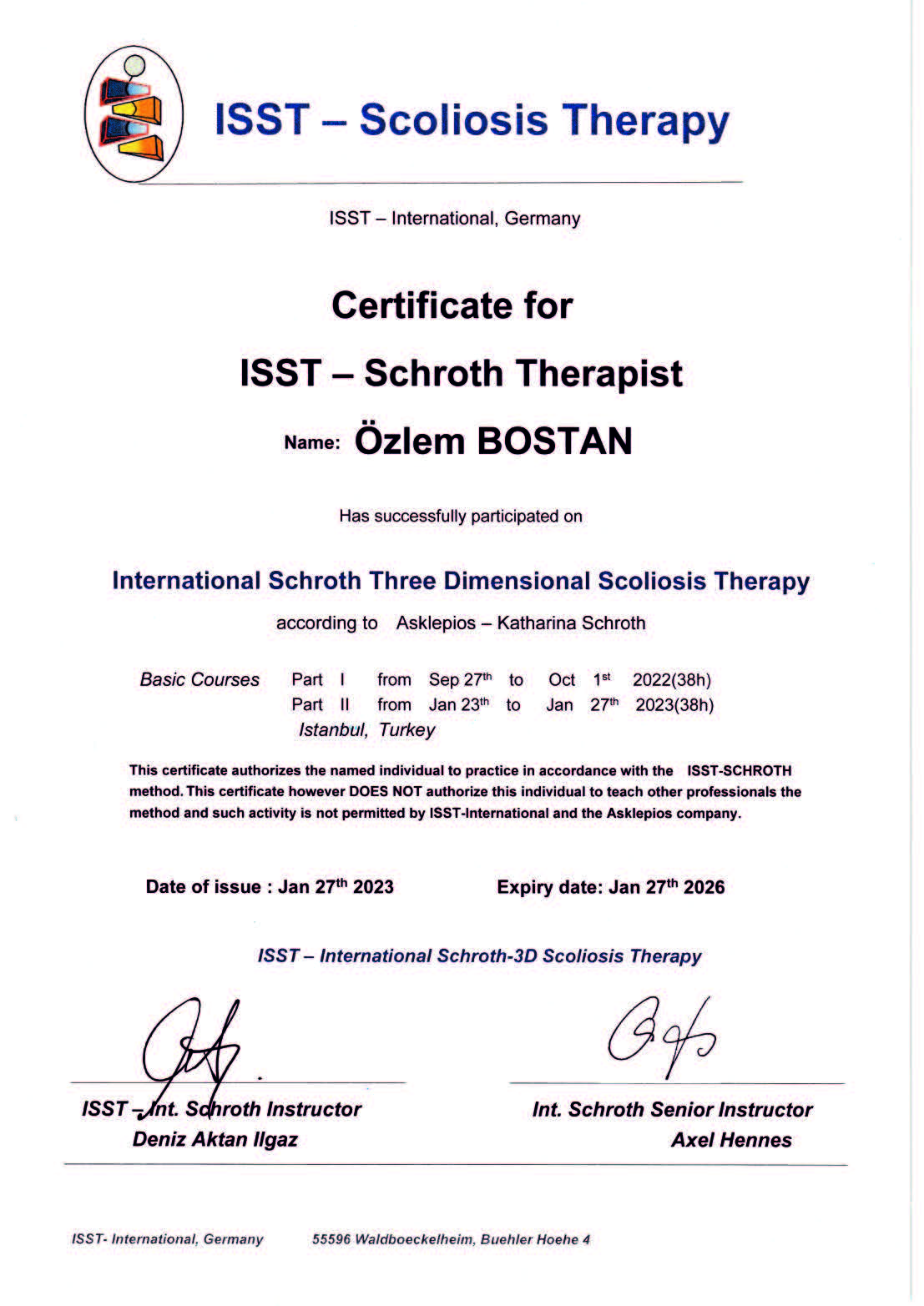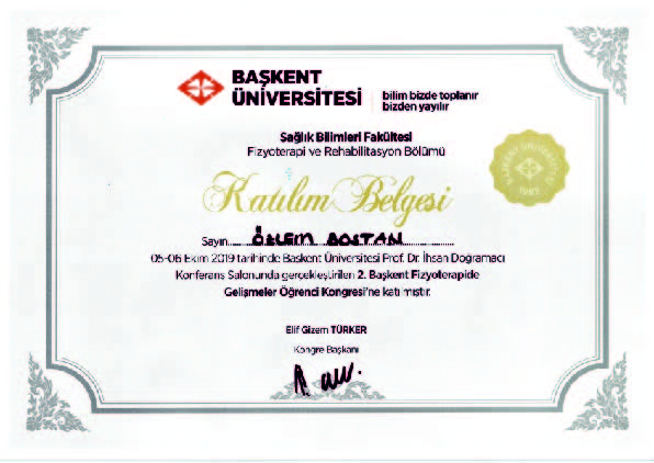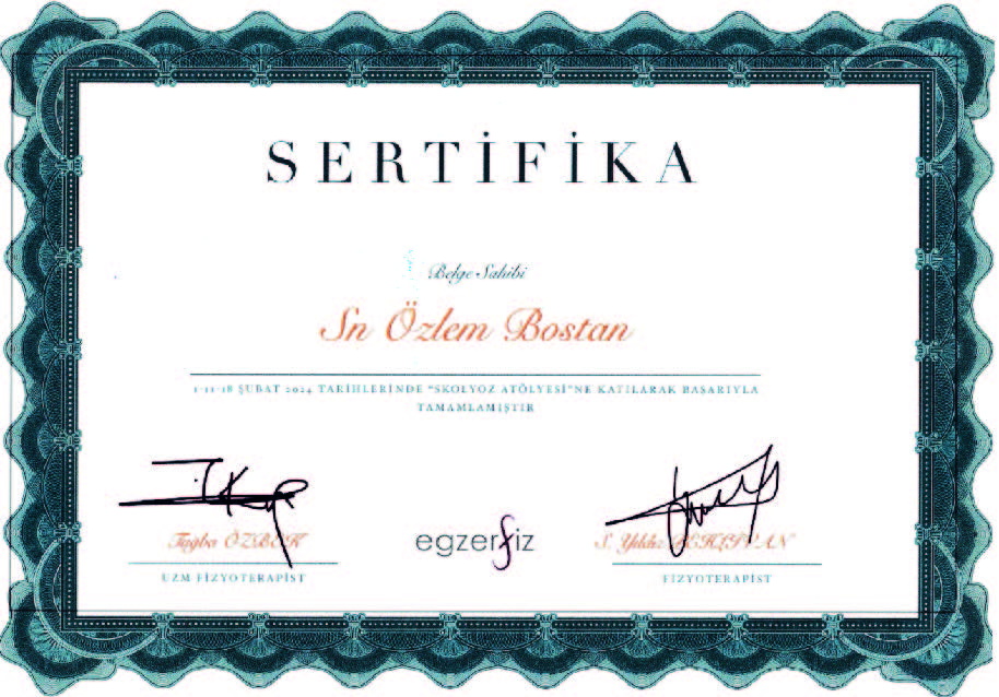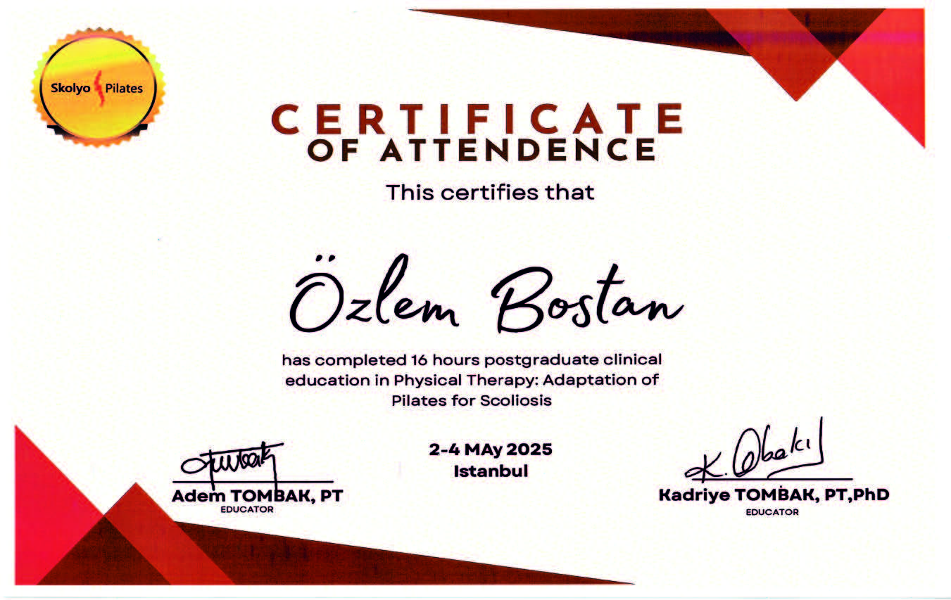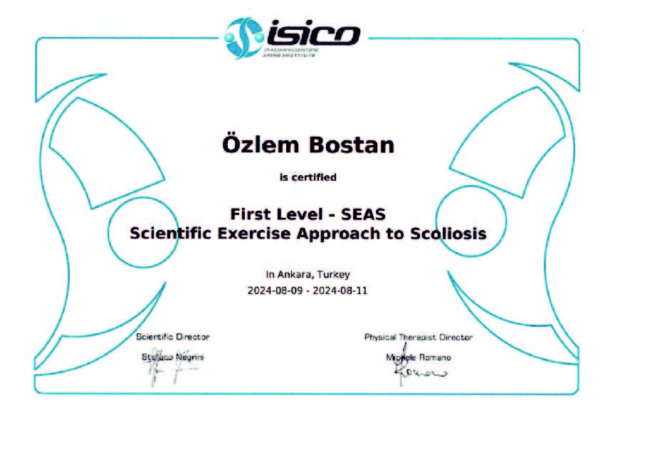 ortopedik, nörolojik ve pediatrik rehabilitasyon uygulamaları yanısıra; manex (manuel therapy neuroscience exercise), isst schroth (international schroth three dimensional scoliosis therapy) isico seas (skolyoza bilimsel egzersiz yaklaşımı), manuel lenf drenajı kompleks boşaltıcı fizyoterapi (manual lymph draninage complex decongestive physio therapy) ve “skolyoz pilatesi” sertifikalarına sahiptir.